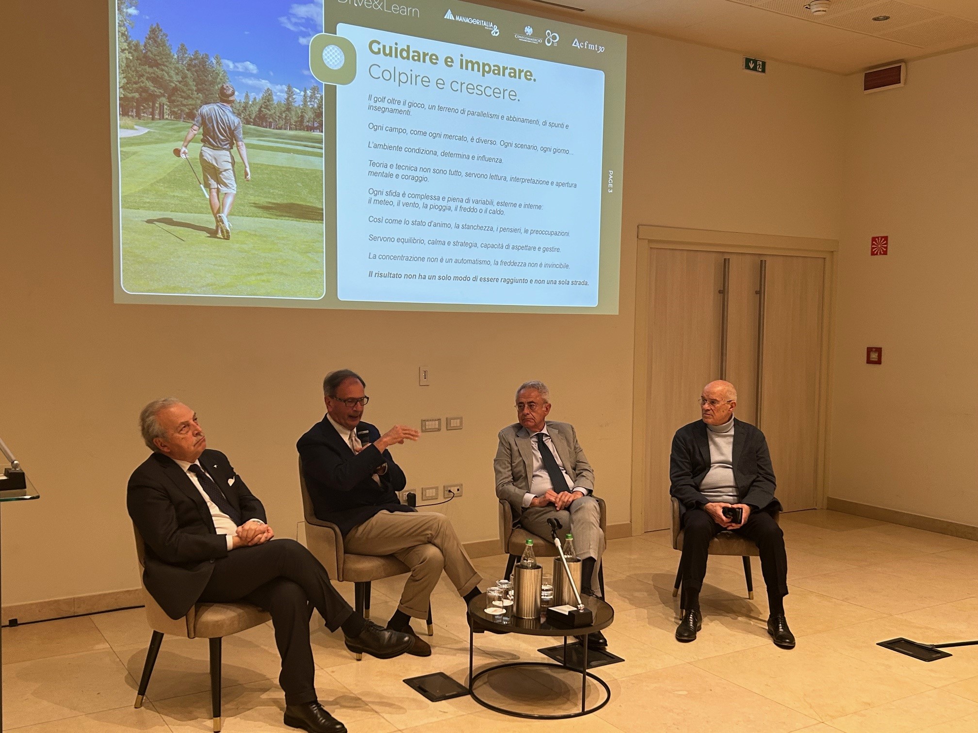 “Grazie ad un progetto come Drive&Learn, il green diventa un’occasione per mettere in campo i valori del management e leggerli con occhi diversi, legandoli a quelli del golf in un’alchimia di sinergie e parallelismi con le capacità dei manager e il compito che questi ogni giorno svolgono in azienda.” Così commenta Guido Carella, presidente Manageritalia Servizi, che prosegue: “Il golf diventa così uno strumento per imparare, giocando, come diventare manager ancora più completi e capaci. Questa iniziativa – conclude Carella – unisce l’aspetto manageriale e quello sportivo, avvicinando a questo sport anche chi non ha mai pensato di praticarlo, creando un ambiente dove voci di altri settori possono trovare terreno fertile per incrementare le proprie opportunità di business, condivisione, conoscenza, relazione e diffusione di visione manageriale unendo divertimento, sfida e formazione”.