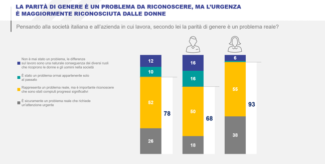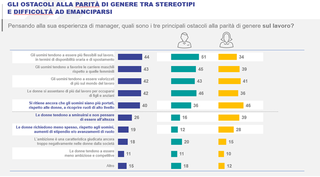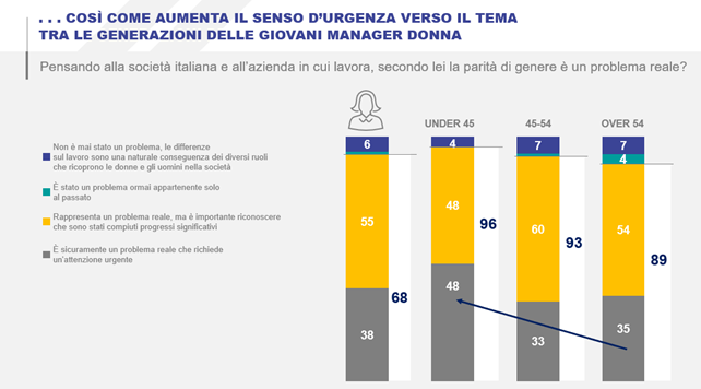 Secondo i dati raccolti da un’indagine Ipsos per Manageritalia, su un campione di oltre 547 manager, sui temi della cultura di genere, per il 78% (93% donne – 68% uomini) la mancanza di parità di genere è un problema reale nella società italiana e spesso anche nell’azienda in cui si lavora. Tre intervistati su quattro hanno inoltre dichiarato di viverla come un reale problema da risolvere, con misure urgenti per il 26% degli intervistati. Opinioni che, seppur con pesi diversi, si confermano anche negli spaccati uomo/donna: il gender gap è un problema per il 68% degli uomini e per il 93% delle donne e richiede un’attenzione urgente per il 18% degli uomini e per il 38% delle donne (vedi Tab. 1). La ricerca di un’autentica parità di genere viene sentita come un’urgenza, in maniera inversamente proporzionale rispetto all’età, segno di una mutata consapevolezza, soprattutto da parte delle donne più giovani (vedi Tab. 2). L’indagine evidenzia inoltre il permanere nella nostra società di alcuni stereotipi di genere duri da abbattere (vedi Tab. 3). Il 40% del campione ritiene ancora che gli uomini siano più portati, rispetto alle donne, a ricoprire ruoli di alto livello (36% per gli uomini e 46% per le donne). Per il 26% del campione “Le donne tendono a sminuirsi e non pensare di essere all’altezza” (16% per uomini e 39% per donne). Infine, le donne richiedono meno spesso, rispetto agli uomini, aumenti di stipendio e/o avanzamenti di ruolo.