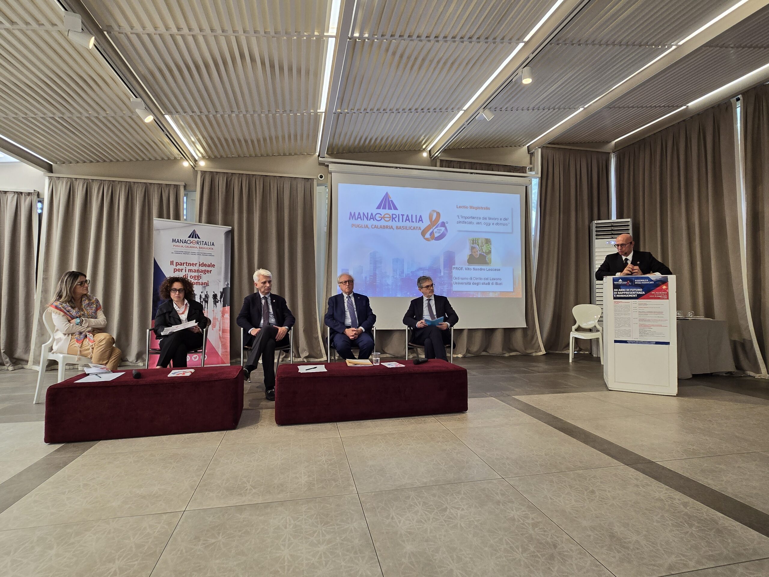 L’appuntamento di oggi ha permesso ai dirigenti presenti di confrontarsi sulle evoluzioni in atto nel mondo del lavoro, del sindacato e sul ruolo sempre più determinate dei manager nell’economia territoriale ma, soprattutto, nella sua parte pubblica, di celebrare il prestigioso traguardo degli 80anni di Manageritalia, la Federazione dei dirigenti del terziario nata a Roma il 9 aprile 1945. Una realtà che non è solo un’associazione di rappresentanza ma una vera comunità, una rete di persone che conta oltre 45mila iscritti tra manager, dirigenti, executive professional e quadri che operano nel settore più strategico, quello dei servizi, e che oggi come allora, contribuiscono al progresso del Paese. Il ruolo centrale dalla rappresentanza sindacale è stato ripercorso grazie alla Lectio Magistralis “L’importanza del lavoro e del sindacato: ieri, oggi e domani” tenuta dal Prof. Vito Sandro Leccese, ordinario di Diritto del Lavoro, Università degli Studi di Bari “Aldo Moro”.