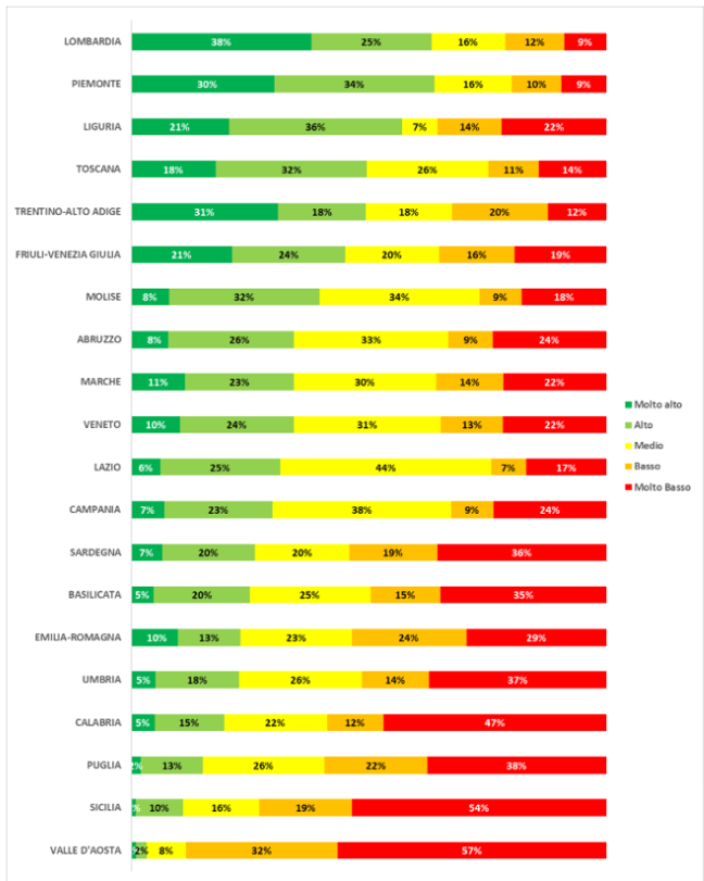 Se si considera lo score ambientale elaborato CRIF (vedi grafico), le regioni più virtuose sono Lombardia e Piemonte, con oltre il 60% delle aziende con un alto livello di adeguatezza. La Sicilia si classifica al penultimo posto con solo il 10% di aziende ad un alto livello di adeguatezza, seguita solo dalla Valle D’Aosta al 2%. Dati che esprimono quanto ancora ci sia da fare per favorire e affermare una nuova cultura della sostenibilità e dei vantaggi economici che essa comporta.