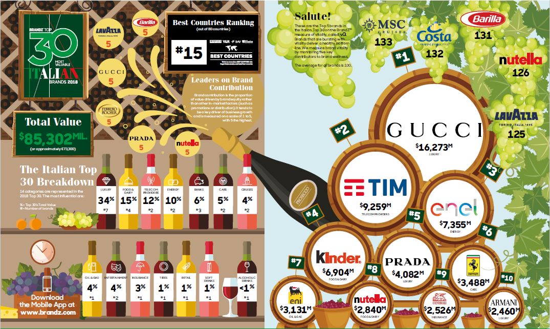 Una classifica, presentata insieme alla società di comunicazione Wpp, dove spicca un unico nome del made in italy, Gucci, considerato tale dai ricercatori nonostante ora sia di proprietà del colosso francese della moda, Kering. Gucci, per valore economico, è in testa alla classifica nazionale di BrandZ e da solo pesa 16 miliardi. Seguono Tim ed Enel. Ma i nostri marchi non volano a livello globale. Solo il 17% è percepito innovativo e oggi l’elemento innovazione è determinante per dare e mantenere valore economico a un brand.