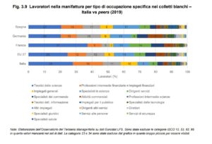 • Anche l’Italia segue le tendenze globali verso una quota crescente di lavoratori di servizi nel settore manifatturiero, ma conserva una significativa presenza di lavoratori “colletti blu” nel manifatturiero. Negli altri maggiori paesi europei come Germania e Francia la presenza di lavoratori di servizi all’interno delle aziende manifatturiere è più marcata rispetto a quelli di produzione.