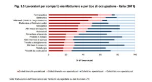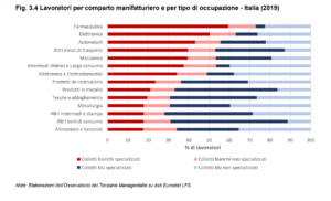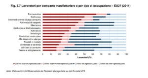 Grazie alla disaggregazione dei dati Eurostat rispetto alla classificazione statistica delle attività economiche (NACE) è possibile addentrarsi nella composizione delle posizioni lavorative all’interno dei diversi comparti della manifattura. La variazione non riguarda soltanto la quantità di forza lavoro impiegata in prestazioni di servizi, ma anche la qualità del lavoro manifatturiero. Esaminando il livello di specializzazione, emerge che in alcuni specifici settori è aumentato il numero di colletti bianchi specializzati a discapito dei colletti blu.