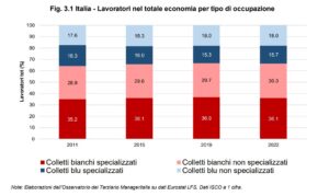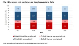 L’Italia sembra infatti seguire la tendenza europea di decrescita nella percentuale di colletti blu qualificati impiegati nella manifattura (e al contempo una crescita dei colletti bianchi qualificati nel periodo della pandemia – dato probabilmente non strutturale in quanto molto influenzato dalle politiche del lavoro del periodo): comunque dal 2011 al 2022 il contributo del personale specializzato nei servizi è divenuto via via più rilevante. Durante l’ultimo anno disponibile, è possibile notare una significativa presenza di colletti bianchi, suggerendo una crescente “terziarizzazione” del settore. L’incidenza dei servizi di mercato osservata nella produzione manifatturiera nel precedente capitolo trova conferma nella composizione dell’occupazione italiana nel settore manifatturiero.