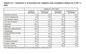 • Tra il 2011 e il 2022, in Italia, la quota di lavoratori adibiti ad attività di servizi nel settore manifatturiero è cresciuta del 3,1%, con un aumento particolarmente pronunciato per le categorie specializzate.