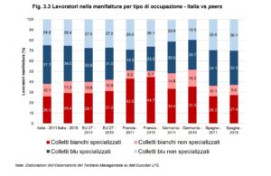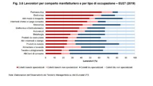 Nel caso italiano la forte presenza di personale specializzato dei servizi si rileva nel settore farmaceutico, nell’elettronica e negli autoveicoli. I colletti blu non specializzati continuano a essere fondamentali nel comparto chimico e nel settore di alimentari e bevande e altri beni di consumo. Rimane prevalente la componente dei colletti blu specializzati soprattutto nella categoria di riparazione e installazione e in tutte le altre categorie non citate. Questo scenario non è necessariamente rispecchiato negli altri paesi e tantomeno nella media europea. Le maggiori differenze si trovano infatti nei settori dominati dai colletti blu non specializzati.