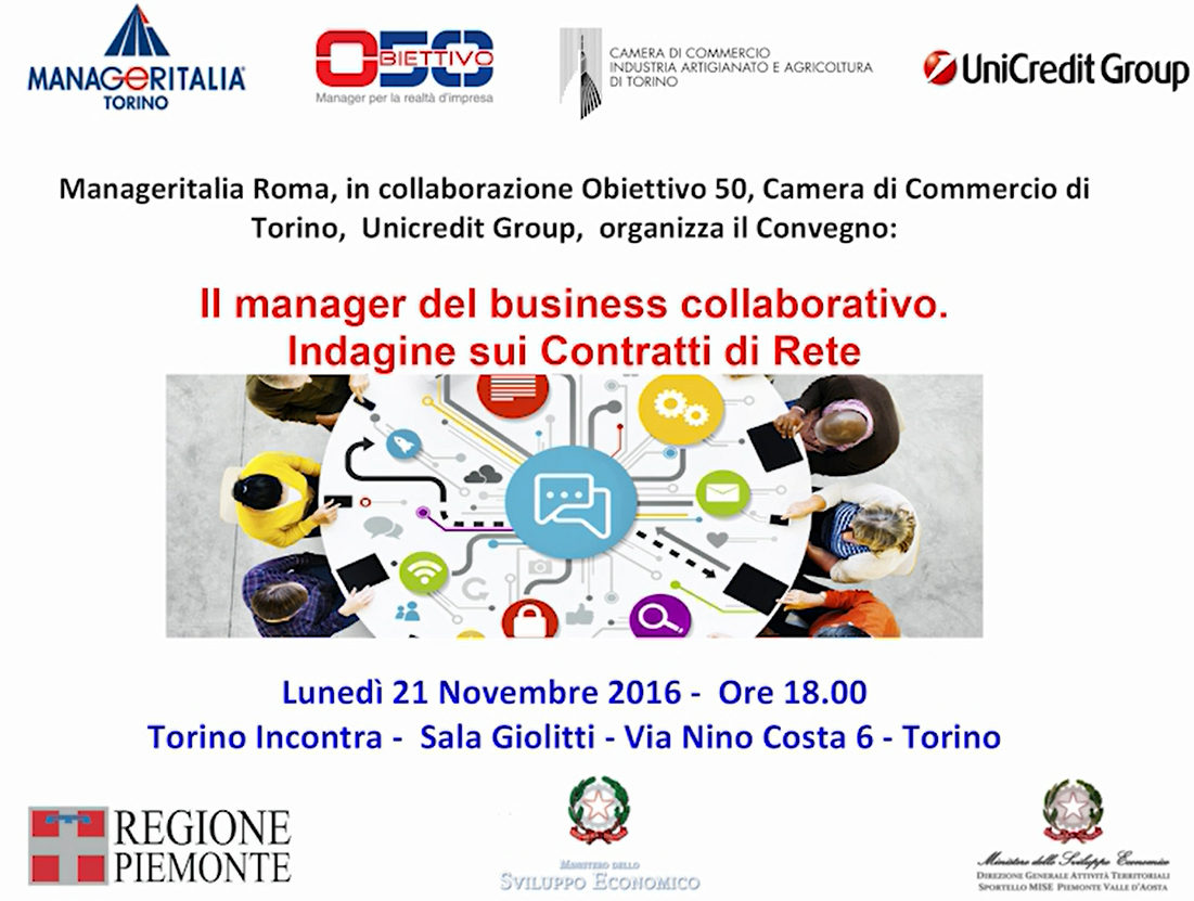 Il 21 novembre a Torino si è svolto l’incontro “Il manager del business collaborativo. Indagine sui contratti di rete”. Un’occasione interessante che, partendo dai risultati di un’indagine realizzata a livello nazionale da Manageritalia e Obiettivo 50 (su un campione di centinaia di aziende che hanno dato vita a un totale di 92 contratti di rete localizzati in Piemonte, Lombardia, Emilia Romagna, Trentino Alto Adige, Lazio, Molise, Abruzzo, Umbria, Sardegna e Sicilia), ha permesso di offrire una fotografia della situazione in seguito all’emanazione della legge sui contratti di rete del 2009.