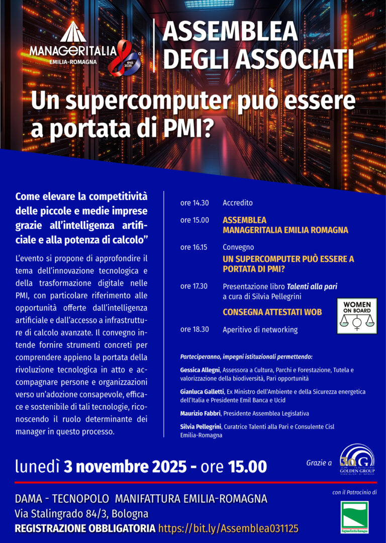 La prossima Assemblea Manageritalia Emilia Romagna è convocata per lunedì 3 novembre 2025 presso DAMA – Tecnopolo Manifattura Emilia-Romagna – Via Stalingrado, 84/3 – Bologna, alle ore 08.00 in prima convocazione e alle ore 15.00 (accredito ore 14.45) in seconda convocazione, per discutere e deliberare sul seguente ordine del giorno: