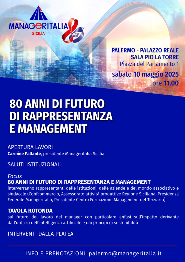 interverranno rappresentanti delle istituzioni, delle aziende e del mondo associativo e sindacale (Confcommercio, Assessorato attività produttive Regione Siciliana, Presidenza Federale Manageritalia, Presidente Centro Formazione Management del Terziario) - TAVOLA ROTONDA sul futuro del lavoro del manager con particolare enfasi sull’impatto derivante dall’utilizzo dell’intelligenza artificiale e dai principi di sostenibilità