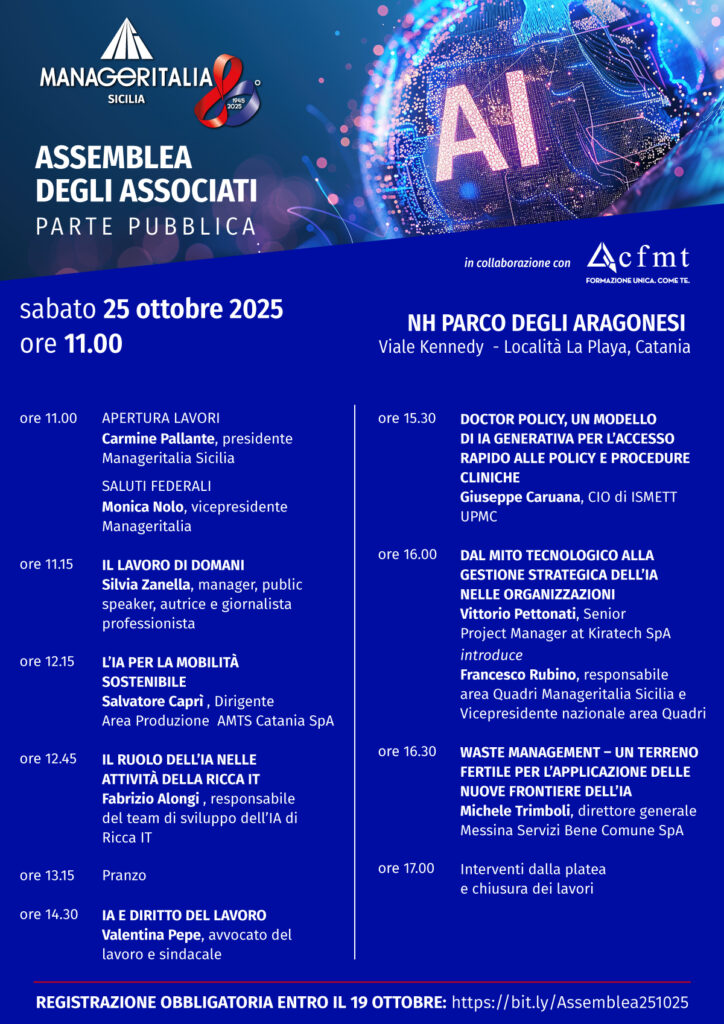 L’Assemblea degli Associati Manageritalia Sicilia è convocata per il giorno 25 ottobre 2025 alle ore 7:00 in prima convocazione ed alle ore 9:45 in seconda convocazione – presso l’NH Parco degli Aragonesi – Viale Kennedy – Località La Playa – Catania per discutere e/o deliberare sul seguente