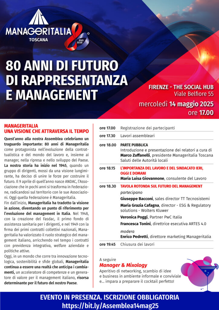 Quest’anno alla nostra Assemblea celebriamo un traguardo importante: 80 anni di Manageritalia come protagonista nell’evoluzione della contrattualistica e del mondo del lavoro e, insieme ai manager, nella ripresa e nello sviluppo del Paese.