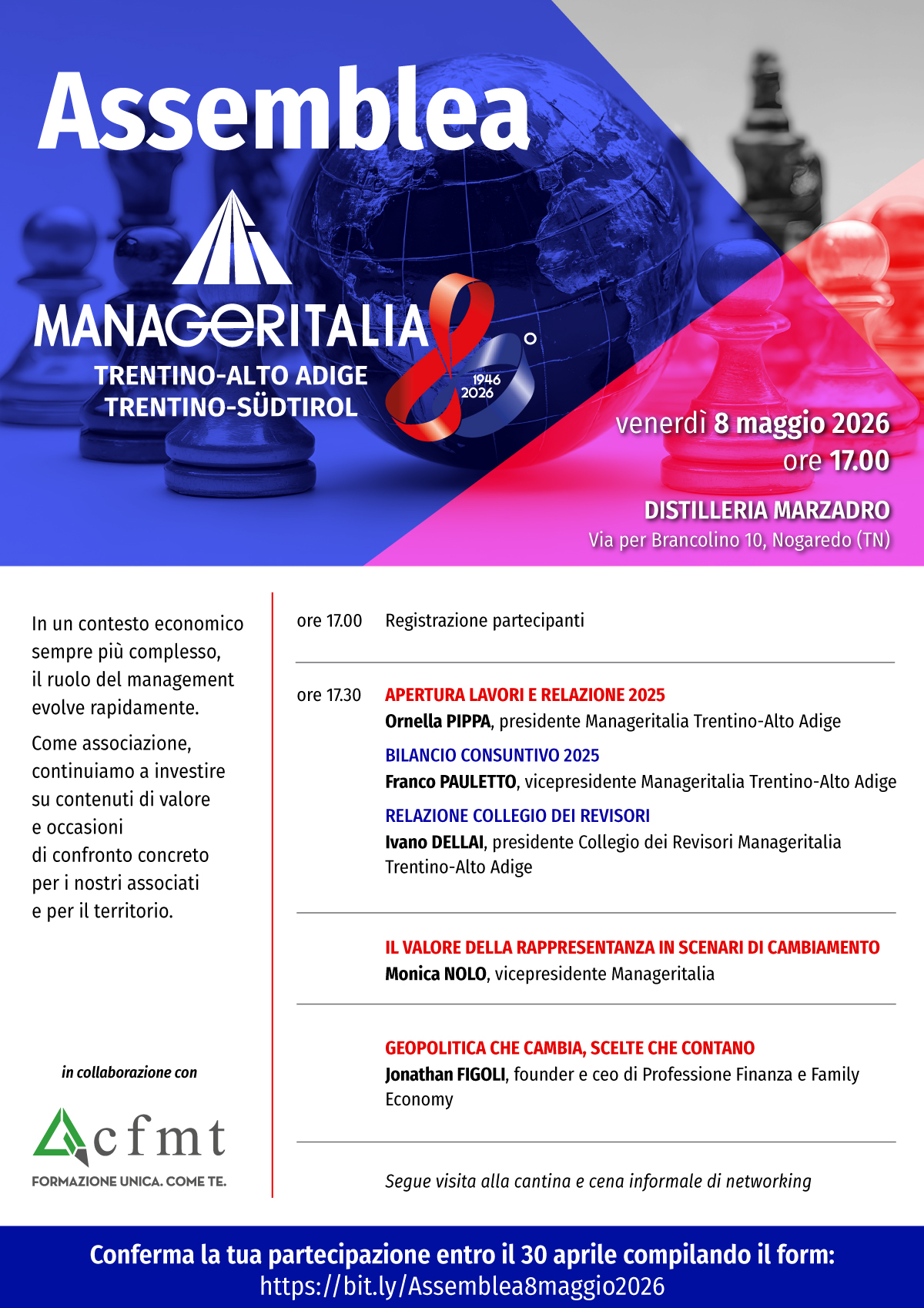 L’Assemblea Manageritalia Trentino-Alto Adige si terrà venerdì 8 maggio 2026 presso Distilleria Marzadro – Via per Brancolino 10 – NOGAREDO (TN) alle ore 15.00 in prima convocazione e alle ore 17.30 in seconda convocazione (registrazione partecipanti dalle ore 17.00) per discutere e deliberare sul seguente ordine del giorno: