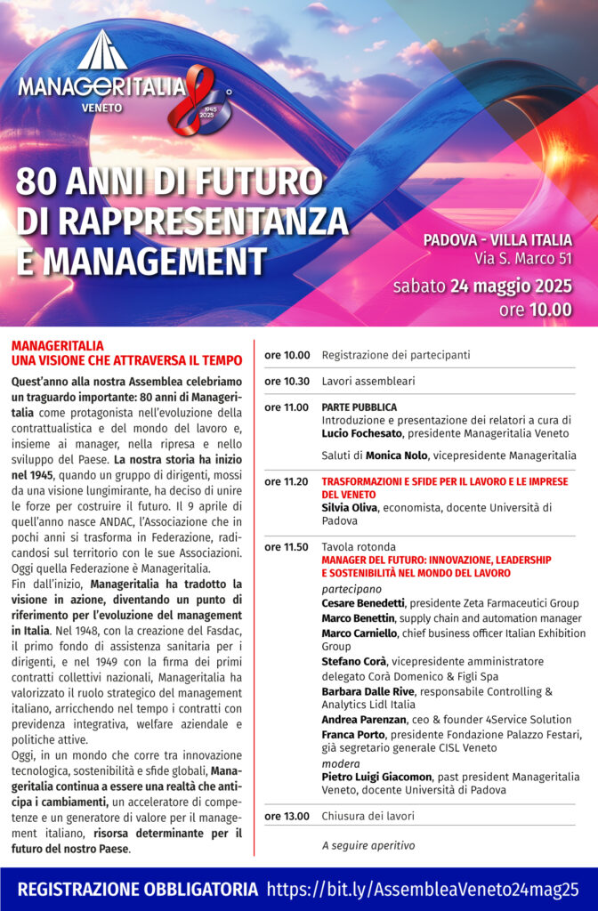 Oggi, in un mondo che corre tra innovazione tecnologica, sostenibilità e sfide globali, Manageritalia continua a essere una realtà che anticipa i cambiamenti, un acceleratore di competenze e un generatore di valore per il management italiano, risorsa determinante per il futuro del nostro Paese.