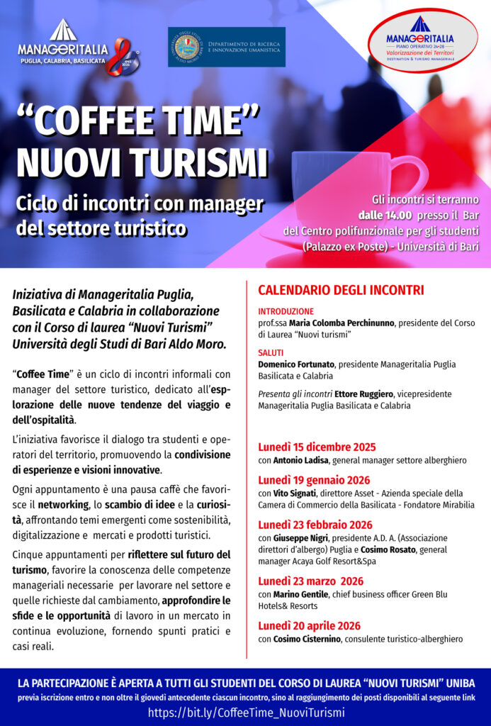 Iniziativa di Manageritalia Puglia, Basilicata e Calabria in collaborazione con il Corso di laurea “Nuovi Turismi” Università degli Studi di Bari Aldo Moro.