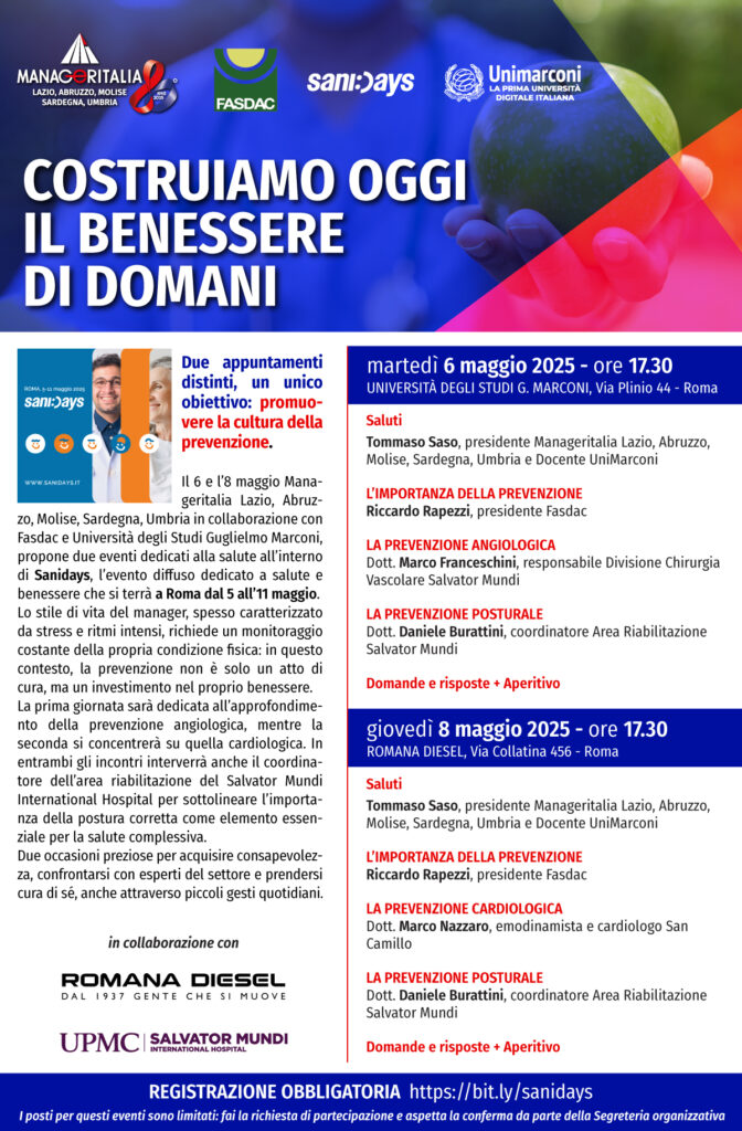 propone due eventi dedicati alla salute all’interno di Sanidays, l’evento diffuso dedicato a salute e benessere che si terrà a Roma dal 5 all’11 maggio.