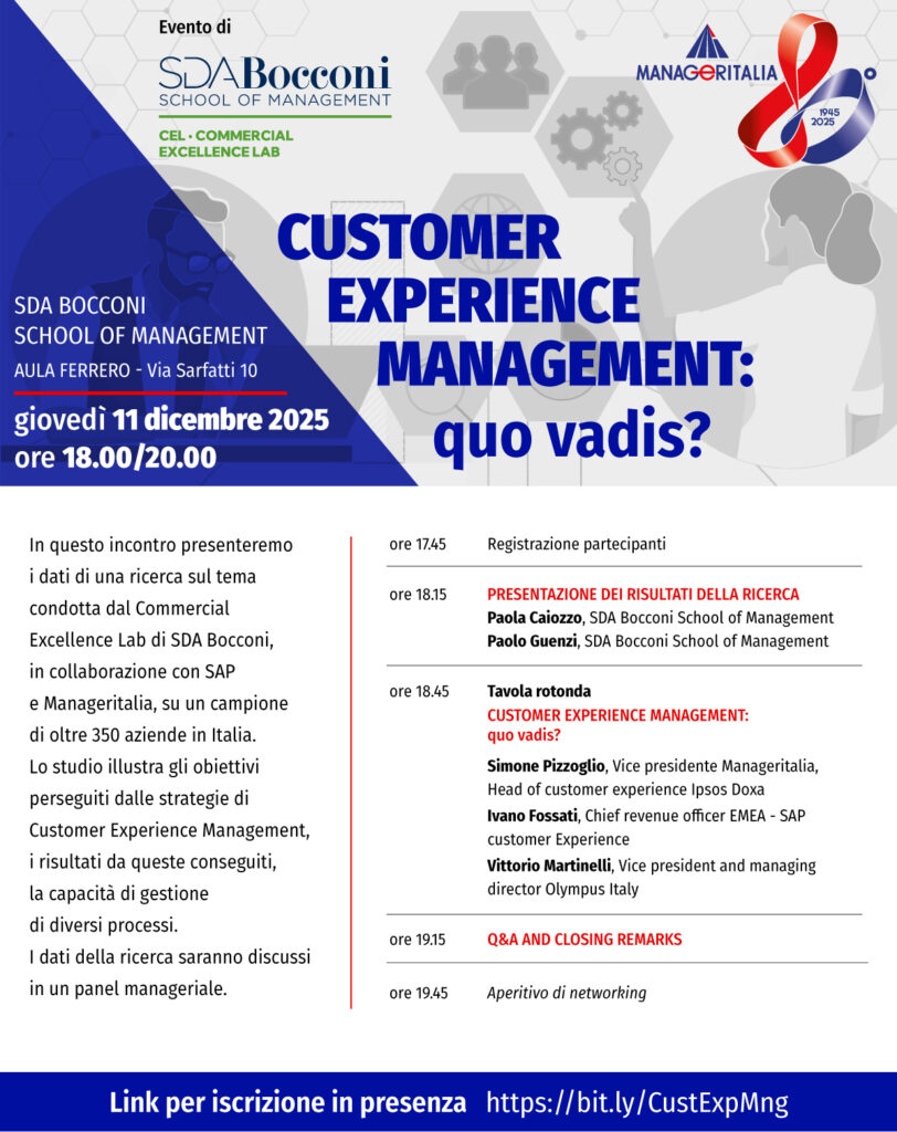 Lo studio illustra gli obiettivi perseguiti dalle strategie di Customer Experience Management, i risultati da queste conseguiti, la capacità di gestione di diversi processi. I dati della ricerca saranno discussi in un panel manageriale.
