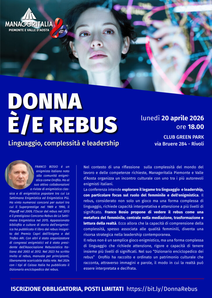 La conferenza intende esplorare il legame tra linguaggio e leadership, con particolare focus sul ruolo del femminile e dell’enigmistica. Il rebus, considerato non solo un gioco ma una forma complessa di linguaggio, richiede capacità interpretativa e attenzione a più livelli di significato. Franco Bosio propone di vedere il rebus come una metafora del femminile, centrale nella mediazione, trasformazione e lettura della realtà. Ecco allora che la capacità di comprensione della complessità, spesso associata alle qualità femminili, diventa una risorsa strategica nella leadership contemporanea.