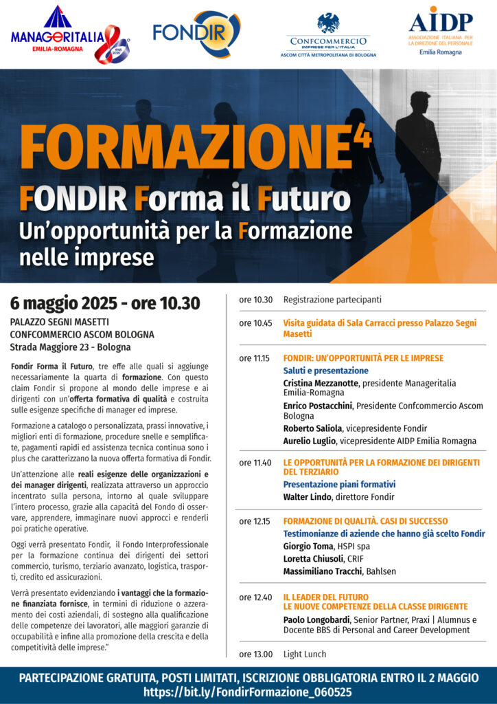 Fondir Forma il Futuro, tre effe alle quali si aggiunge necessariamente la quarta di formazione. Con questo claim Fondir si propone al mondo delle imprese e ai dirigenti con un’offerta formativa di qualità e costruita sulle esigenze specifiche di manager ed imprese.