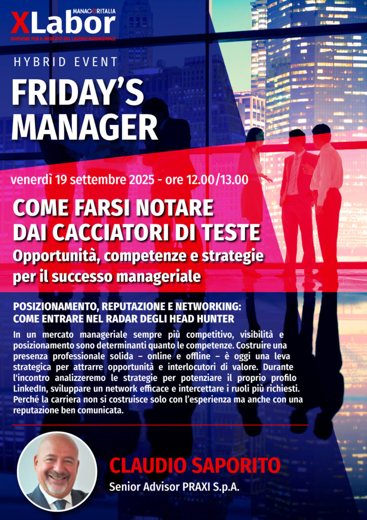 19 settembre 2025: un nuovo appuntamento Friday’s Manager di XLabor, la divisione di Manageritalia dedicata al mercato del lavoro.