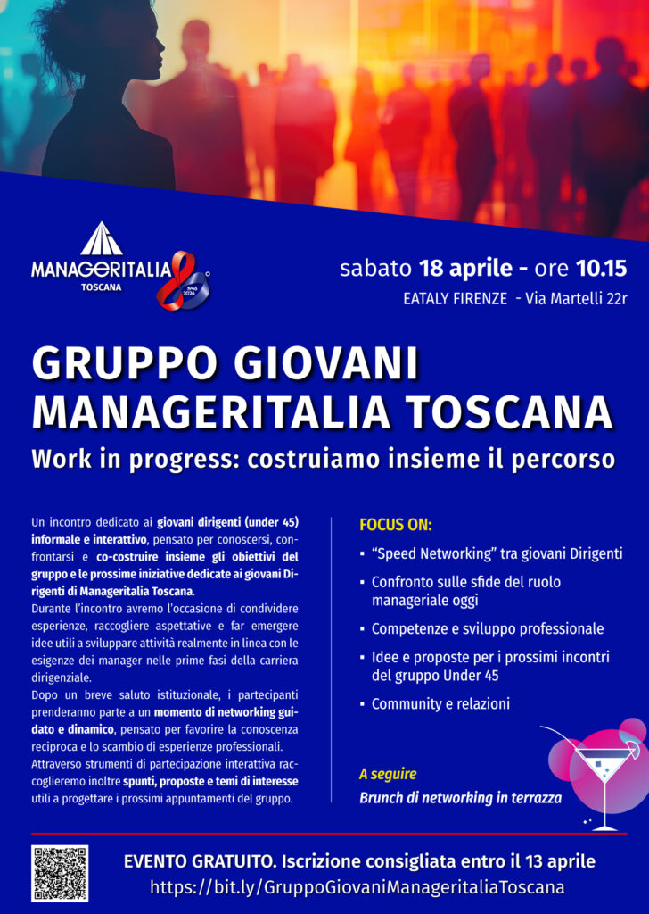 Un incontro dedicato ai giovani dirigenti (under 45) informale e interattivo, pensato per conoscersi, confrontarsi e co-costruire insieme gli obiettivi del gruppo e le prossime iniziative dedicate ai giovani Dirigenti di Manageritalia Toscana.