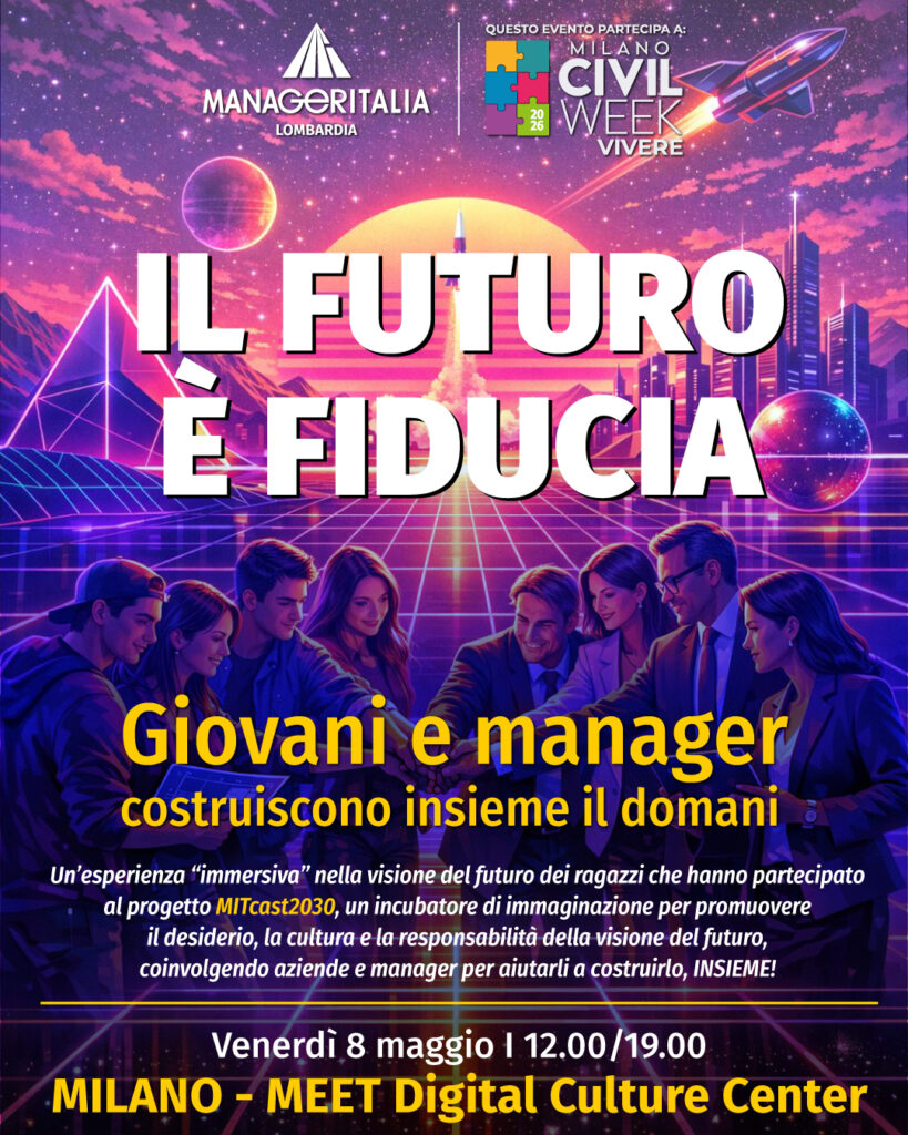 Il Gruppo Manager per il Sociale supporta MITcast2030, l’iniziativa promossa da Manageritalia Lombardia, che ha coinvolto i giovani dai 18 ai 28 anni, invitandoli a immaginare e rappresentare il futuro desiderato attraverso un’immagine. Da questa collaborazione, nasce l’evento Il Futuro è Fiducia: Giovani e manager costruiscono insieme il domani, un’occasione di confronto in cui creatività ed esperienza strategica si intrecciano, dando vita a un dialogo aperto e a un processo di co-progettazione del futuro.