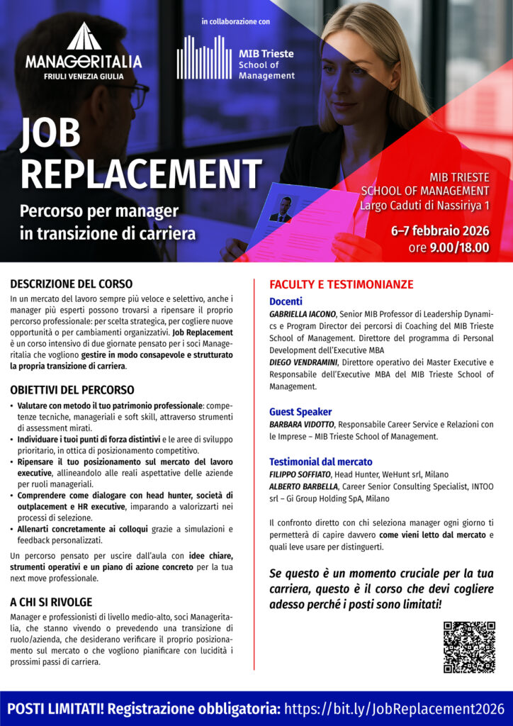 Manageritalia Friuli Venezia Giulia e MIB Trieste School of Management uniscono le proprie competenze per offrire un percorso di sviluppo professionale di alto livello dedicato ai manager in evoluzione. In un mercato del lavoro sempre più dinamico e selettivo, questa collaborazione nasce per fornire strumenti concreti a chi desidera affrontare una transizione di carriera con consapevolezza, metodo e una strategia di posizionamento chiara.