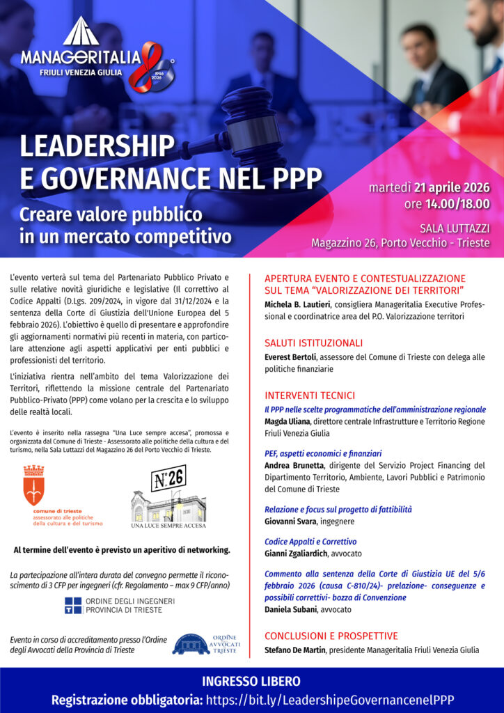 L’evento verterà sul tema del Partenariato Pubblico Privato e sulle relative novità giuridiche e legislative (Il correttivo al Codice Appalti (D.Lgs. 209/2024, in vigore dal 31/12/2024 e la sentenza della Corte di Giustizia dell’Unione Europea del 5 febbraio 2026).