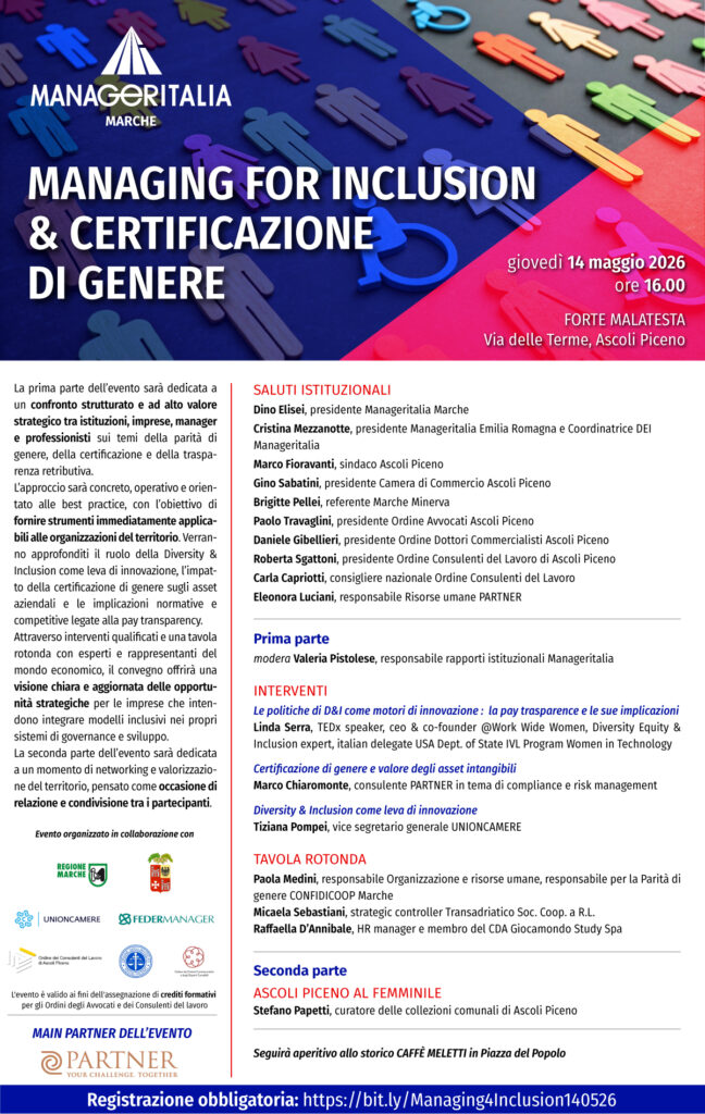 La prima parte dell’evento sarà dedicata a un confronto strutturato e ad alto valore strategico tra istituzioni, imprese, manager e professionisti sui temi della parità di genere, della certificazione e della trasparenza retributiva.