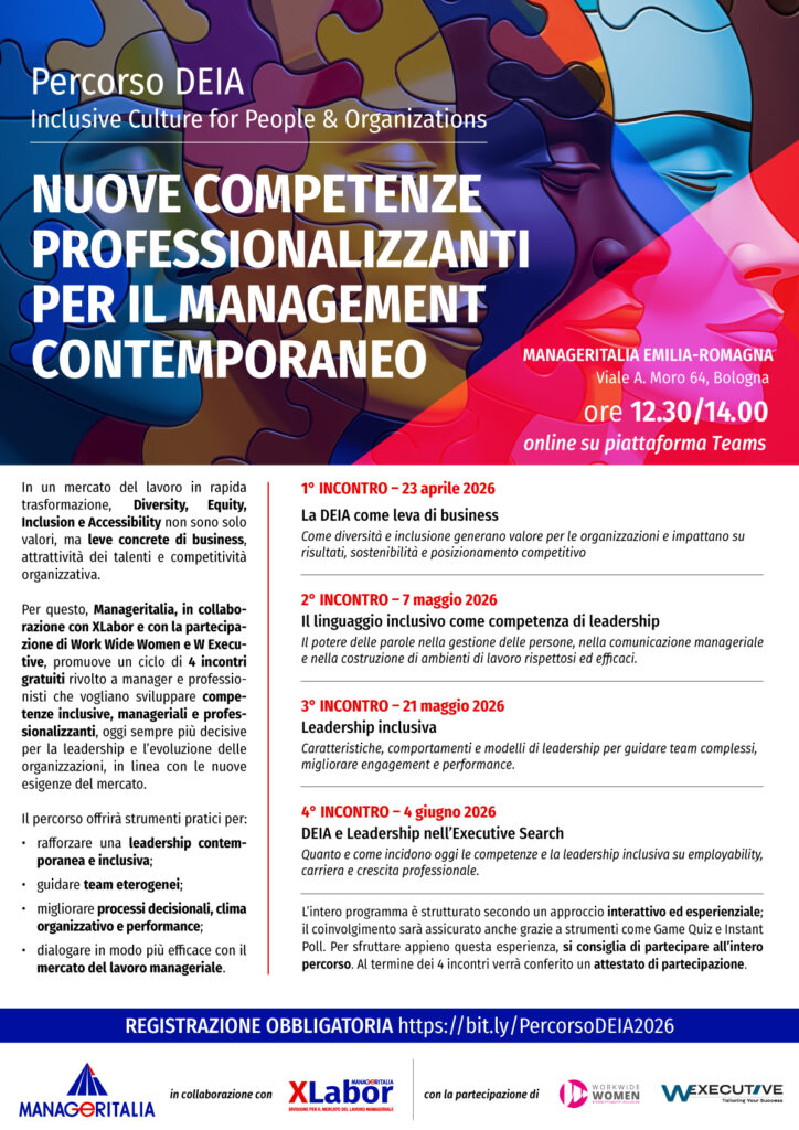 Per questo, Manageritalia, in collaborazione con Work Wide Women, W Executive e XLabor, promuove un ciclo di 4 incontri gratuiti rivolto a manager e professionisti che vogliano sviluppare competenze inclusive, manageriali e professionalizzanti, oggi sempre più decisive per la leadership e l’evoluzione delle organizzazioni, in linea con le nuove esigenze del mercato.