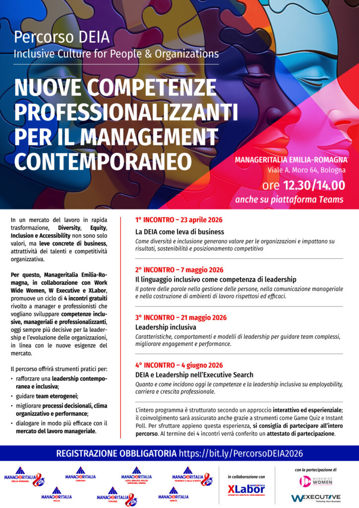 Per questo, Manageritalia Emilia-Romagna, in collaborazione con Work Wide Women, W Executive e XLabor, promuove un ciclo di 4 incontri gratuiti rivolto a manager e professionisti che vogliano sviluppare competenze inclusive, manageriali e professionalizzanti, oggi sempre più decisive per la leadership e l’evoluzione delle organizzazioni, in linea con le nuove esigenze del mercato.
