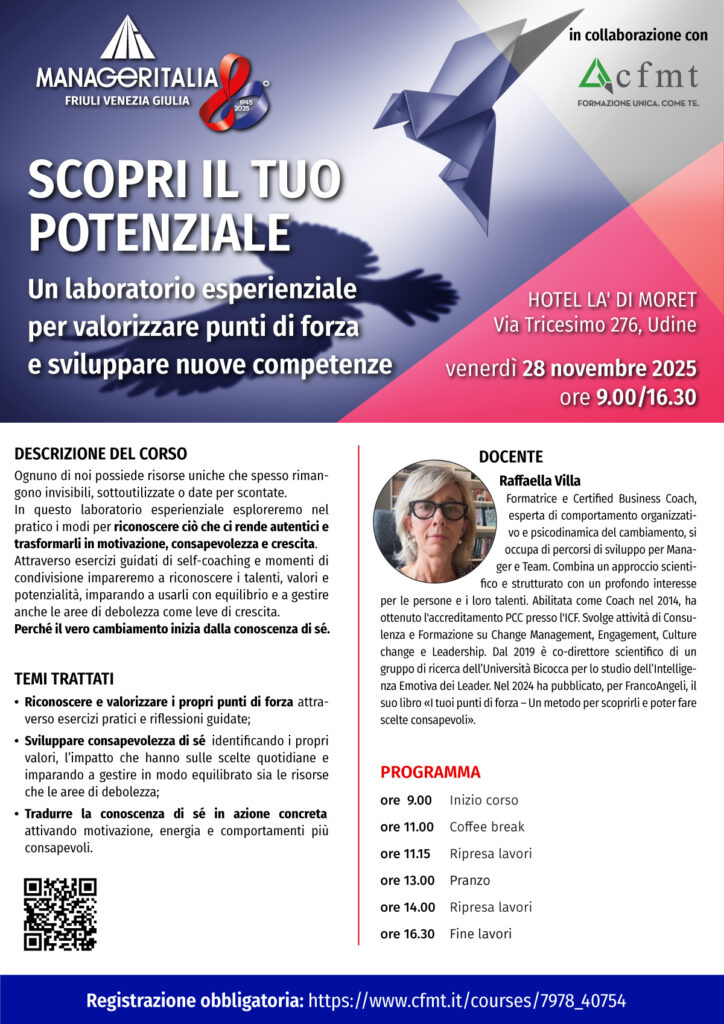 Attraverso esercizi guidati di self-coaching e momenti di condivisione impareremo a riconoscere i talenti, valori e potenzialità, imparando a usarli con equilibrio e a gestire anche le aree di debolezza come leve di crescita. Perché il vero cambiamento inizia dalla conoscenza di sé.
