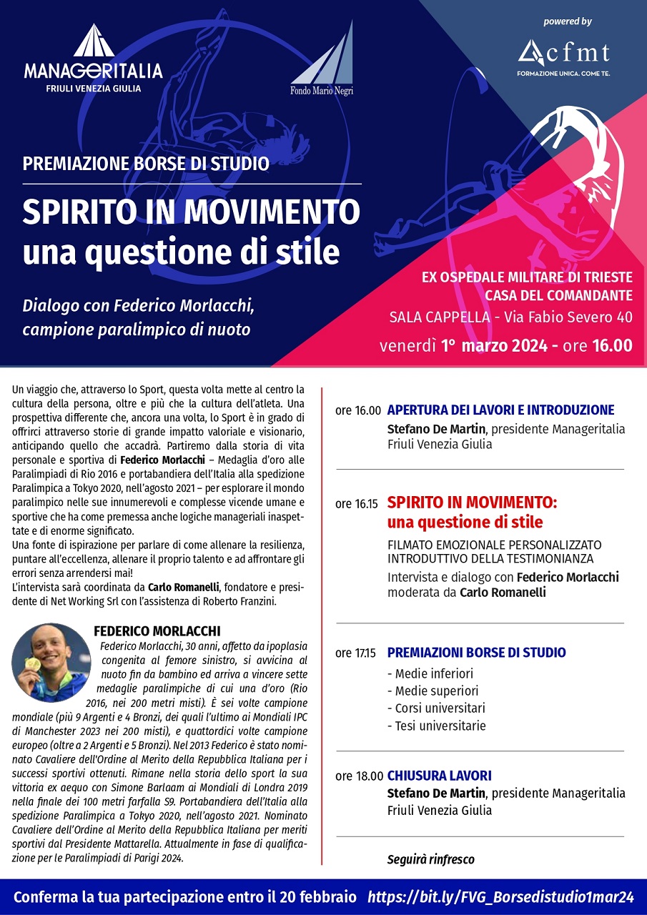 Partiremo dalla storia di vita personale e sportiva di Federico Morlacchi – Medaglia d’oro alle Paraolimpiadi di Rio 2016, sei volte campione mondiale e quattordici volte campione europeo – per esplorare il mondo paralimpico nelle sue innumerevoli e complesse vicende umane e sportive che ha come premessa anche logiche manageriali inaspettate e di enorme significato. Una fonte di ispirazione per parlare di come allenare la resilienza, puntare all’eccellenza, allenare il proprio talento e ad affrontare gli errori senza arrendersi mai!