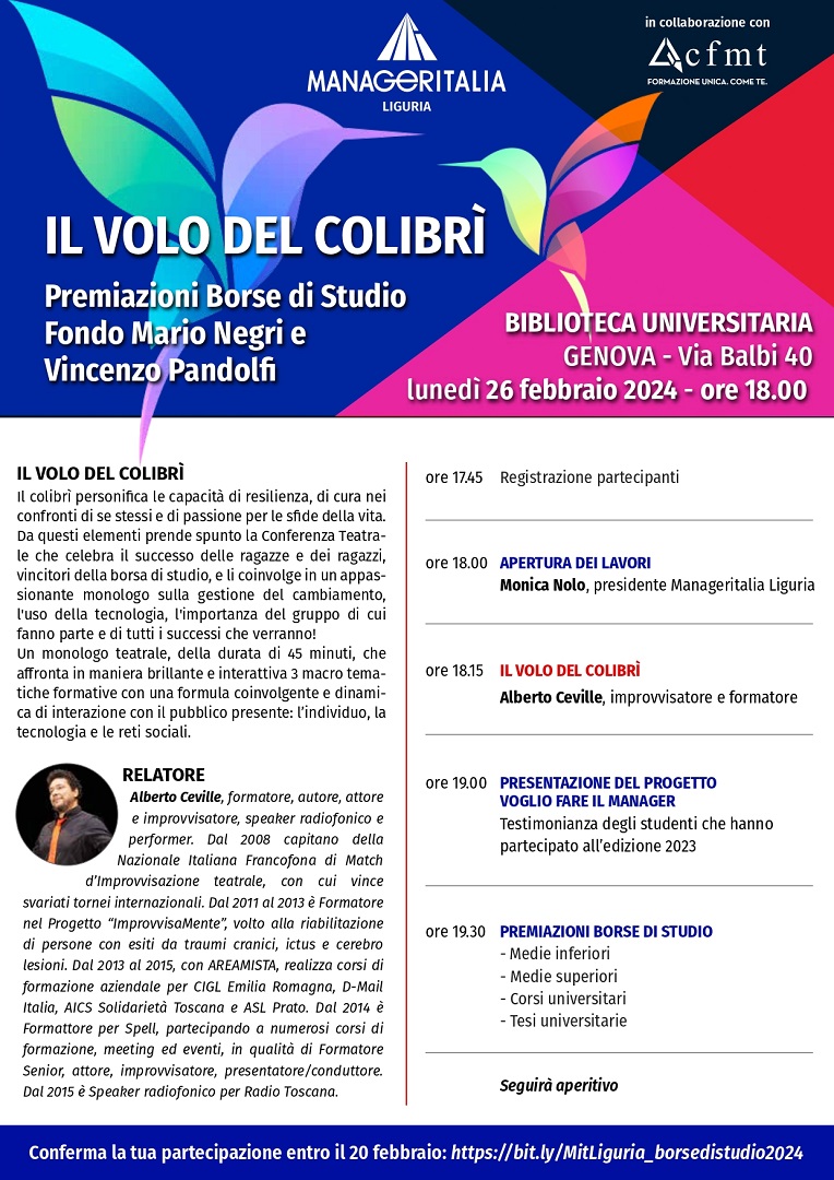 Il colibrì personifica le capacità di resilienza, di cura nei confronti di se stessi e di passione per le sfide della vita. Da questi elementi prende spunto la conferenza teatrale che celebra il successo delle ragazze e dei ragazzi, vincitori della borsa di studio, e li coinvolge in un appassionante monologo sulla gestione del cambiamento, l’uso della tecnologia, l’importanza del gruppo di cui fanno parte e di tutti i successi che verranno!