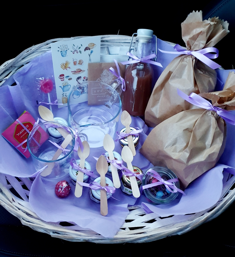 Consiste in un bel bouquet di fiori accompagnato da un cestino con tutto ciò che può servire per regalare uno splendido risveglio a chi lo riceve, brioche appena sfornate, pane di segale con varie marmellatine, caffè, tè o infusi, qualche cioccolatino, succhi di frutta… il cestino, le tazze e le bottigliette restano al destinatario del regalo, ed inoltre gli lascio sempre anche una bustina di semi da piantare, il mio desiderio è che così ogni volta che vedrà quegli oggetti o vedrà spuntare i fiori ripenserà al piacere di aver ricevuto una tale sorpresa, la ricollegherà a me e, come è già accaduto in diverse occasioni, vorrà regalarla a sua volta a qualcun altro.