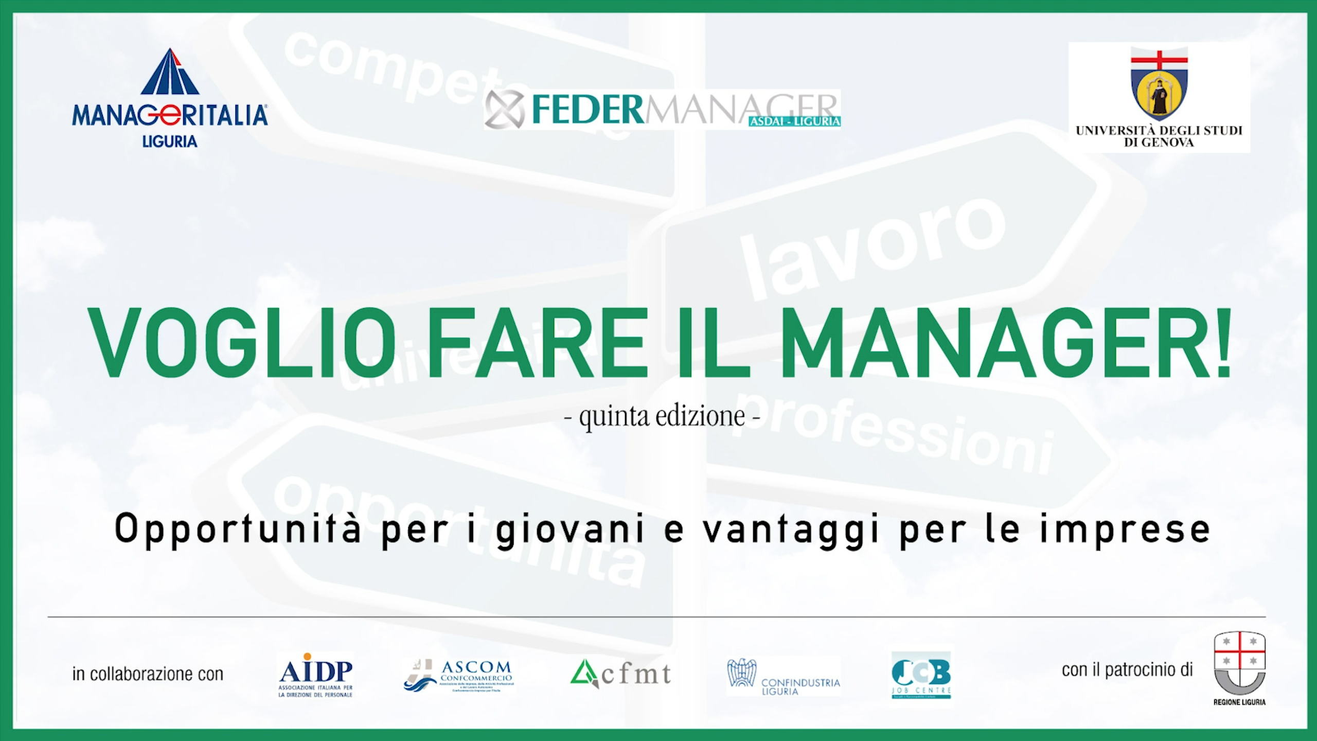“Voglio fare il manager” è il progetto ideato da Manageritalia Liguria con l’Università degli Studi di Genova che vede giovani laureandi della città passare alcuni giorni in azienda a fianco di un dirigente. Ormai alla quinta edizione, quest’anno l’iniziativa ha visto la collaboraizone di Federmanager Liguria, Aidp, Cfmt, Ascom Confcommercio Liguria, Confindustria Liguria e Job Center.