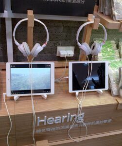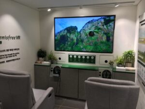 E addirittura si è invitati ad ascoltare i suoni dell’isola attraverso un sistema audio via cuffie: ruscelli, vento e il suono delle biciclette che vagano spensierate per Jeju o addirittura sedersi in una postazione di virtual reality ed esplorare l’isola, accompagnati da un’affascinante celebrity coreana.