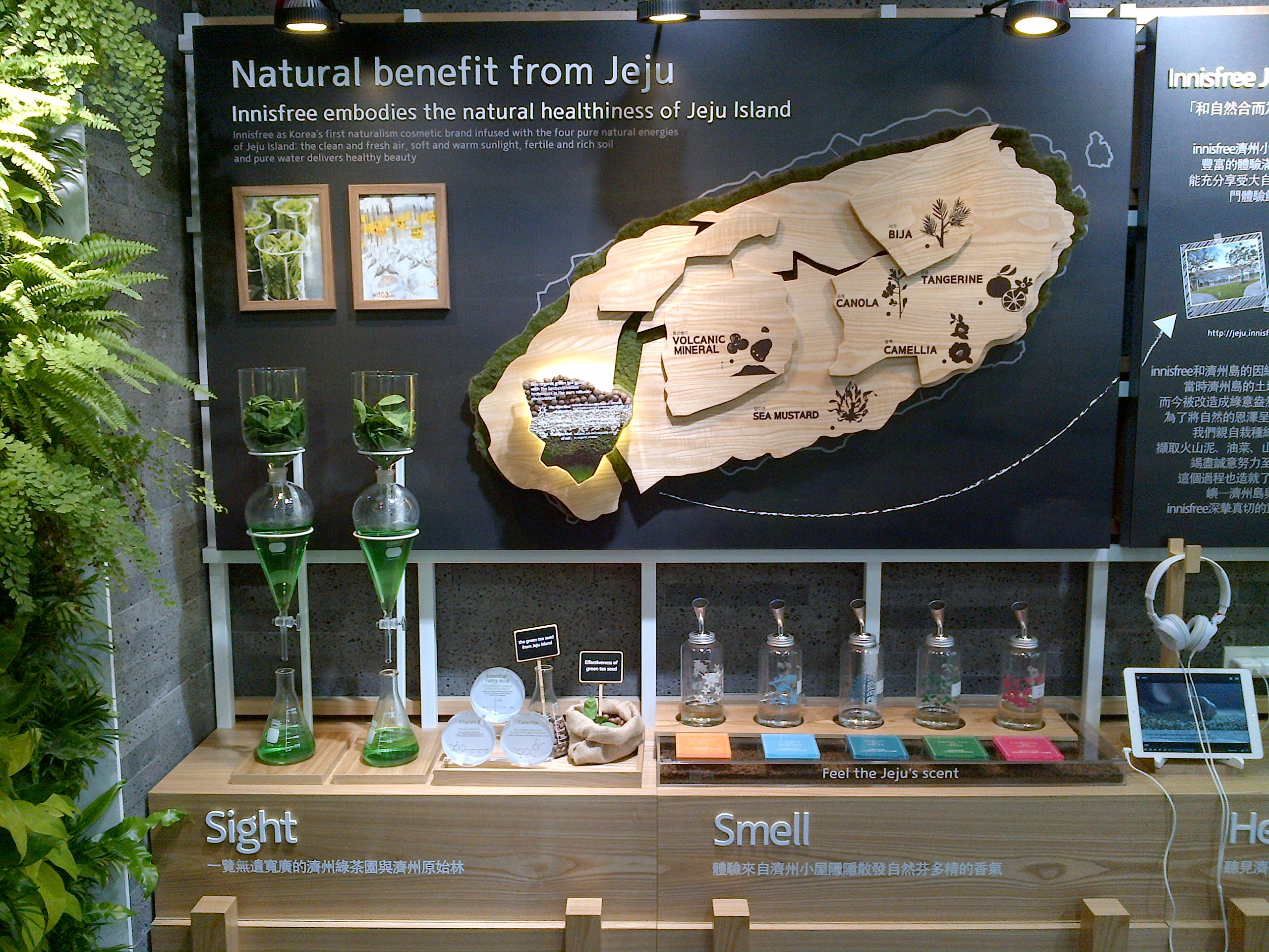 Ma il punto centrale dello storytelling di Innisfree risiede in questo pannello al centro del negozio che descrive le diverse zone dell’isola di Jeju da cui provengono gli ingredienti naturali utilizzati nei cosmetici.