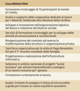 Ha aiutato 293 enti di piccole e grandi dimensioni e realizzato 383 progetti nelle più diverse aree di fragilità, in ambito organizzativo, amministrazione e finanza, marketing e comunicazione, ricerca fondi, risorse umane e formazione, information technology, qualità e privacy. In tempi più recenti, stanno gradualmente aderendo figure più giovani in attività, il che dimostra una crescente sensibilità dei manager nei confronti del bene comune, dovuta anche agli obiettivi di sostenibilità economica e sociale da parte delle aziende.