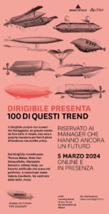 Micro trend, macro trend, mega trend e “nega trend”. In questi 10 anni sul Dirigibile è finito di tutto. E tutto abbiamo fatto per aiutare imprese e manager a cogliere il futuro con un minimo di anticipo. Spesso con ironia, disincanto e distacco, dovuto quando si sorvola il mondo con un Dirigibile alla ricerca di segnali visti dall’alto. Sicuramente qualche previsione l’abbiamo cannata, but who cares? L’importante è partecipare al grande viaggio, che è l’esplorazione del futuro.