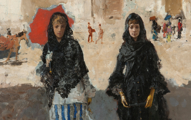 È un pomeriggio assolato del 1870 e due fanciulle attraversano piazza del Duomo lasciandosi alle spalle la cattedrale da cui sono appena uscite. Sono vestite secondo la moda dell’epoca e indossano ancora il velo di pizzo nero, avendo appena assistito alla funzione religiosa. Incedono lentamente come sospese verso noi spettatori, non conversano tra loro; la giovane a sinistra per ripararsi dal sole ha già aperto l’ombrellino, una potentissima macchia rossa che spezza l’andamento dei colori chiari e fa da raccordo con le tonalità scure del terreno su cui si muovono le protagoniste.