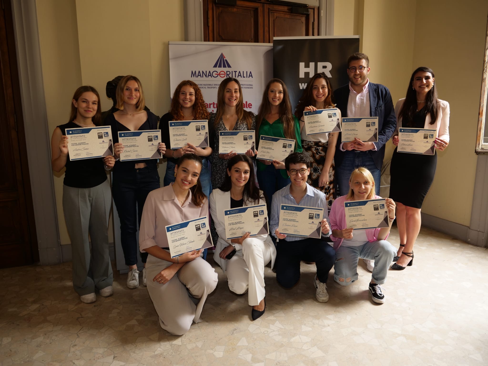 A presentare, il 21 giugno scorso, a stampa e operatori i nuovi “Ambasciatori delle Pari Opportunità” (quattordici ragazze e un ragazzo), oltre ai contenuti del progetto Young Academy for Gender Policies – Generiamo nuova cultura di genere” realizzato da HR WoMen (think tank dedicato all’empowerment femminile per il successo della gender equality), in collaborazione con Human Hall (hub per l’innovazione, l’inclusione e la tutela dei diritti dell’Università degli Studi di Milano) e Manageritalia, con il patrocinio del Tribunale di Milano e del Comune di Milano, sono stati: Alessia Cappello, Assessora alle Politiche del Lavoro del Comune di Milano – Vincenzo Scuotto, fondatore di HR WoMen – Fabio Roia, presidente del Tribunale di Milano – Marilisa D’Amico, prorettrice con delega a Legalità, Trasparenza e Parità di diritti dell’Università Statale di Milano – Maria Pia Abbracchio, prorettrice vicaria dell’Università Statale di Milano e Luisa Quarta, coordinatrice Gruppo Donne Manager Manageritalia.