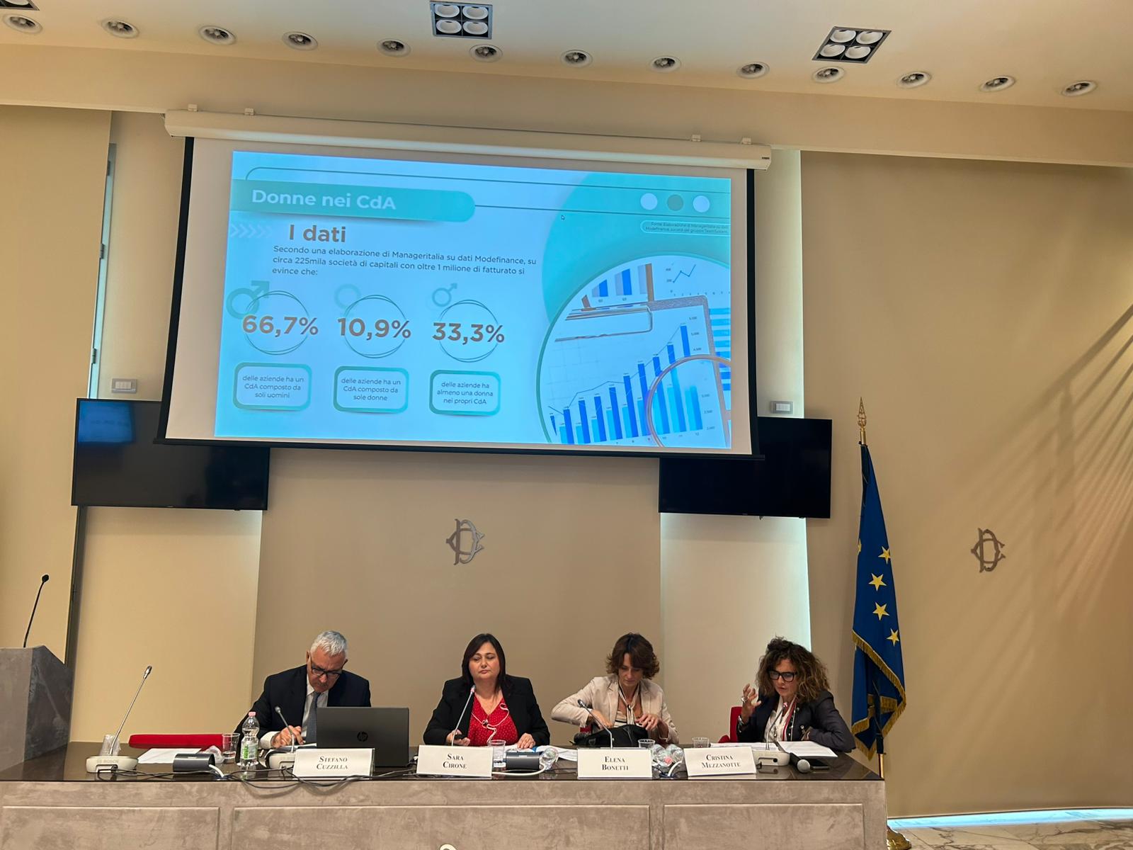 A illustrare i contenuti della terza edizione di Women on Board, durante la mattinata del 7 ottobre presso la Sala Matteotti di Palazzo Theodoli – Bianchelli, Camera dei Deputati sono stati: l’On. Elena Bonetti, già Ministra per le Pari Opportunità e la Famiglia, il Presidente Cida Stefano Cuzzilla e le due ideatrici del progetto, Cristina Mezzanotte (Manageritalia) e Sara Cirone (Federmanager Minerva, AIDP e Hub del Territorio).
