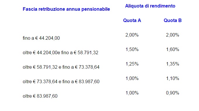 A titolo esemplificativo, nella tabella (in alto nell’immagine) riportiamo le fasce di retribuzione annua pensionabile e le aliquote di rendimento distinte in quota A e quota B per il calcolo delle pensioni da liquidare nel 2012.